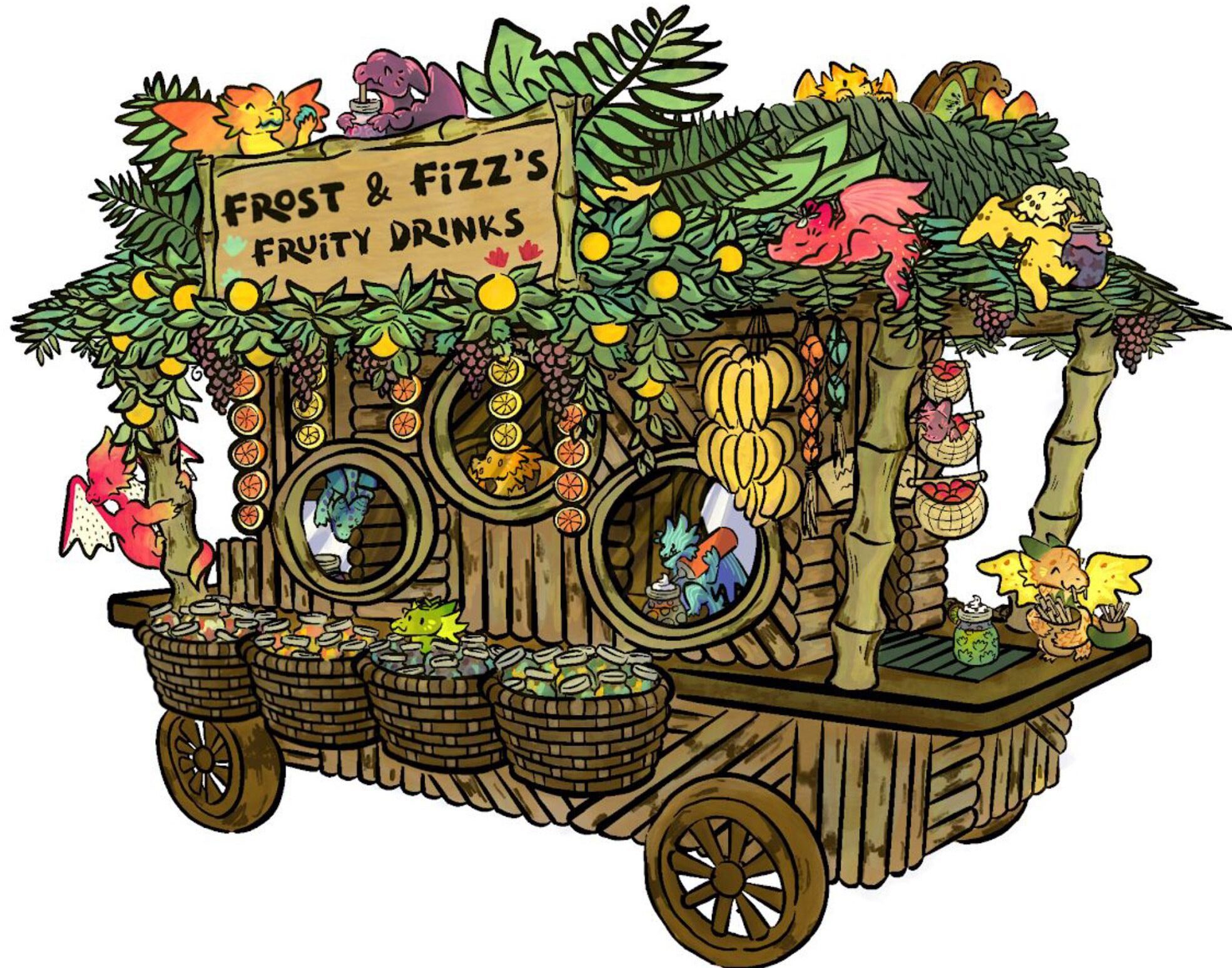 McGinley’s design included character design guides, construction schematics, interactive roles for cart operators, and a show-stopping conveyor belt system where drinks are assembled and frosted by animatronic fruit-inspired dragons. The concept transforms a simple point-of-sale into a miniature themed experience.